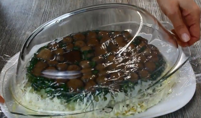 Дістаньте страву з холодильника, накрийте плоскою тарілкою. Далі ємність потрібно перевернути, після чого прибрати салатницю і харчову плівку. Перевертати страву треба різко, але акуратно, щоб не пошкодити шари.![]()