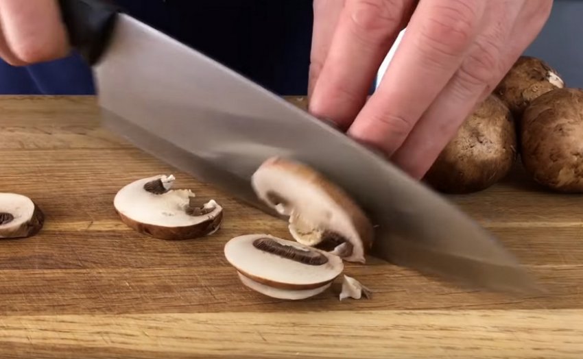 Промити гриби та підрізати ніжки. Нарізати пластинами середньої товщини. Якщо печериці зовсім дрібні, то можна залишити їх цілими.![]()