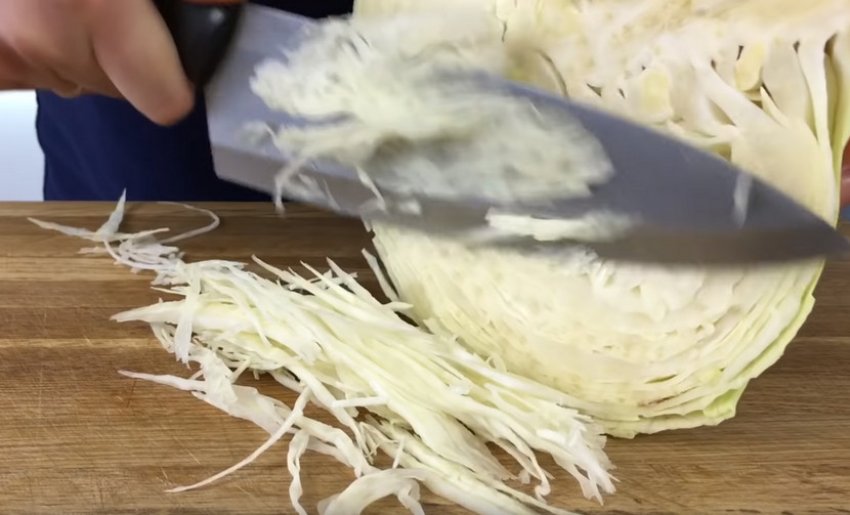 Нашаткувати капусту великою соломкою, додати сіль, після чого розім'яти руками для виділення її рідини.![]()