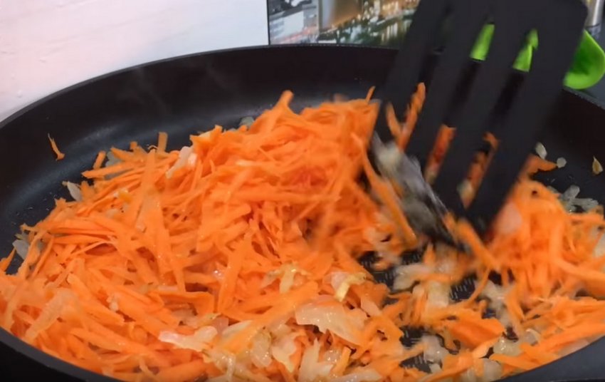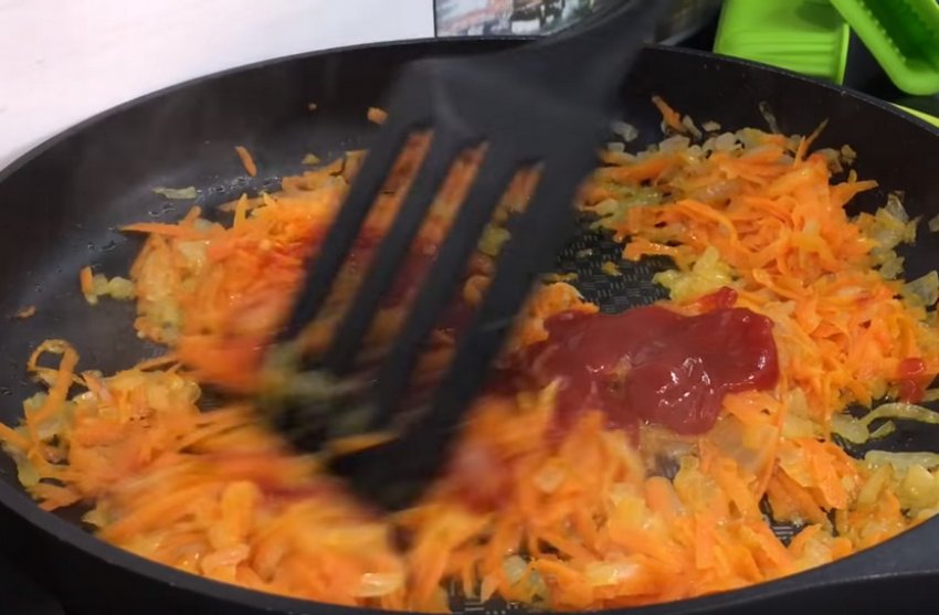 Крупно натерти моркву. Додати її в сковорідку і перемішати. Додати 2 столові ложки томатної пасти, перемішати і смажити кілька хвилин.![]()
