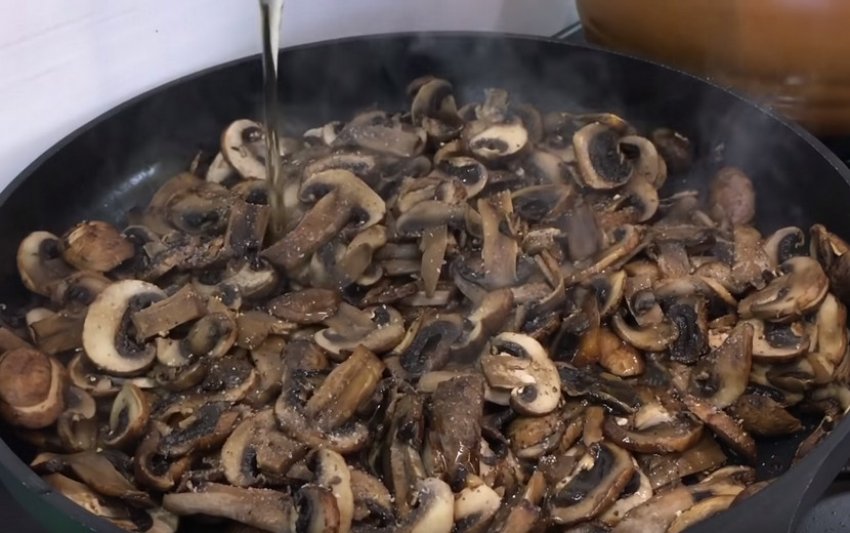 Обсмажити гриби на сильному вогні без кришки, у процесі перемішуючи. Додати сіль і перець.![]()