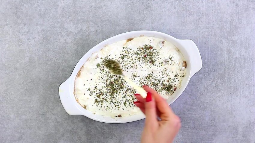приготування сметанного соусу з'єднати сметану, подрібнений часник, кукурудзяний крохмаль і 100 г натертого сиру. Перемішати сирно-сметанно-часниковий соус, що вийшов, і додати в нього (за смаком) кухонну сіль і мелений чорний перець.![]()