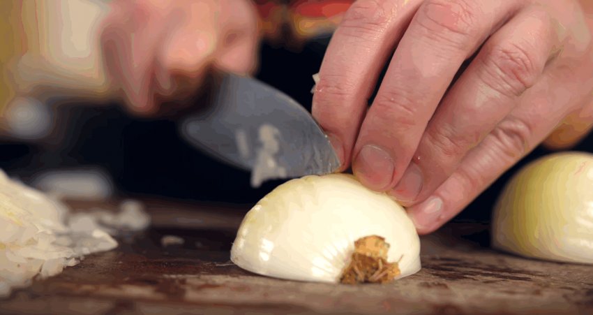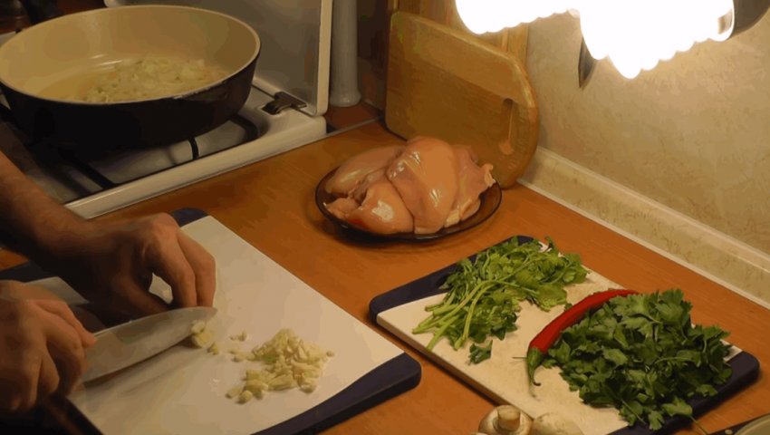 Розчавити за допомогою ножа часникові зубки і з'єднати з цибулею.![]()