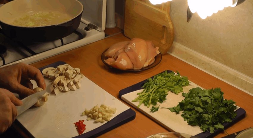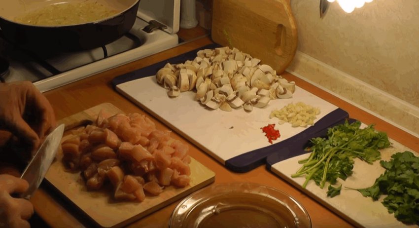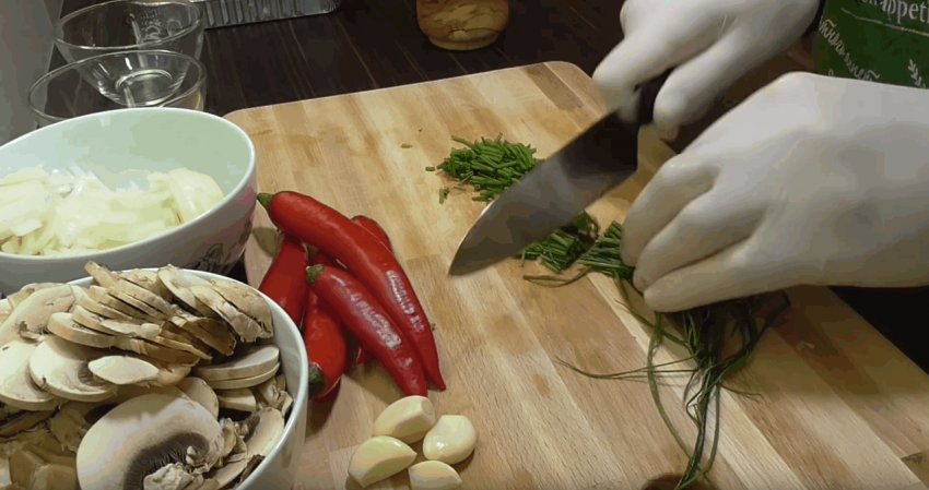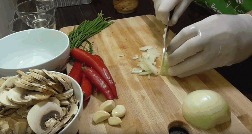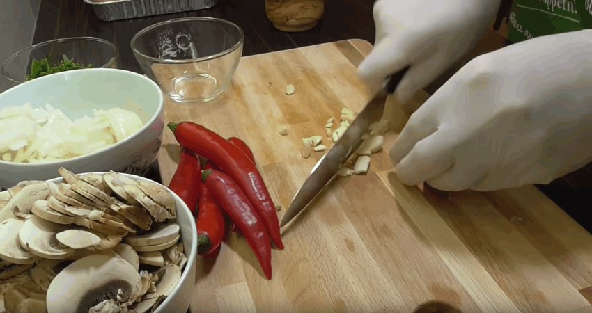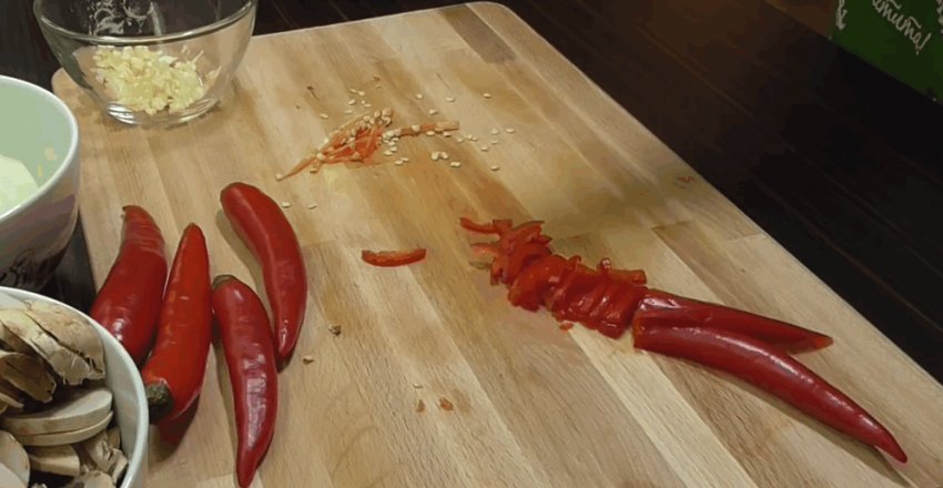 Дрібно подрібнити перець чилі та гриби.![]()