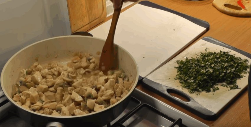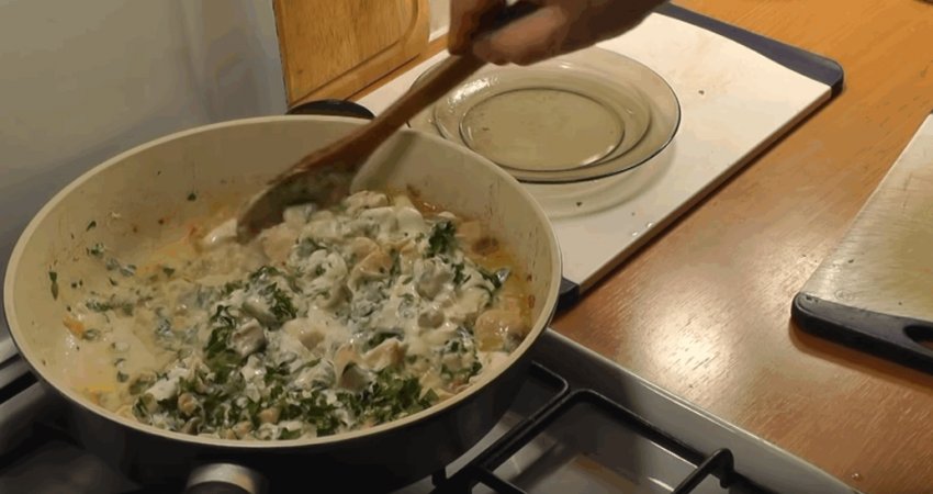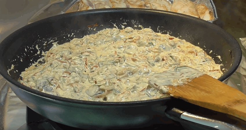 Через 5-7 хвилин викладіть у вершково-грибний соус курячу грудку.![]()