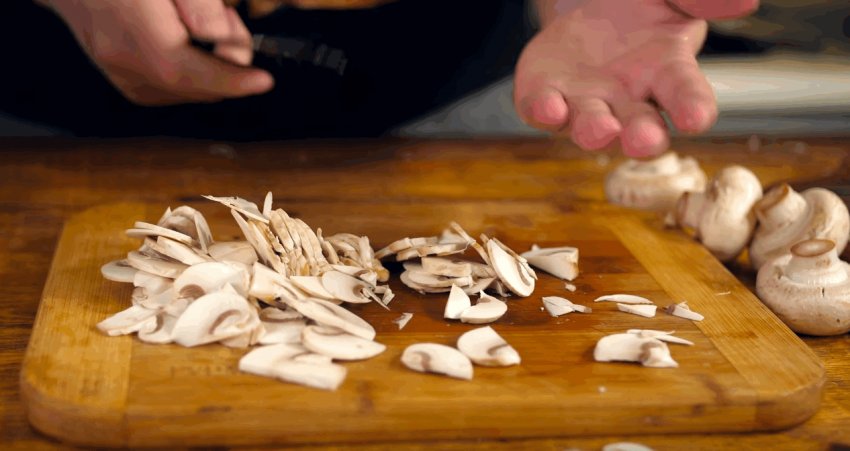 Наріжте гриби тонкими пластинами (близько 3 мм).![]()