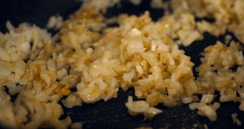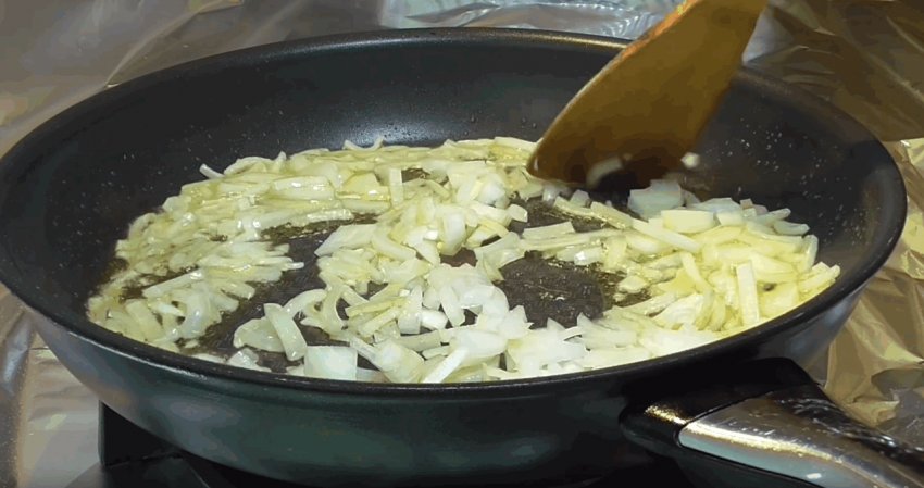 Дрібно нарубати цибулю й обсмажити на розігрітій сковорідці, змащеній олією. Готувати її краще на середньому вогні, щоб нічого не підгоріло.![]()