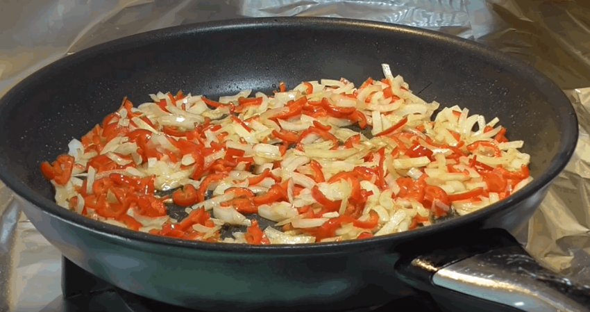 Всипте до цибулі перець. Ретельно змішайте і смажте 5 хвилин.![]()