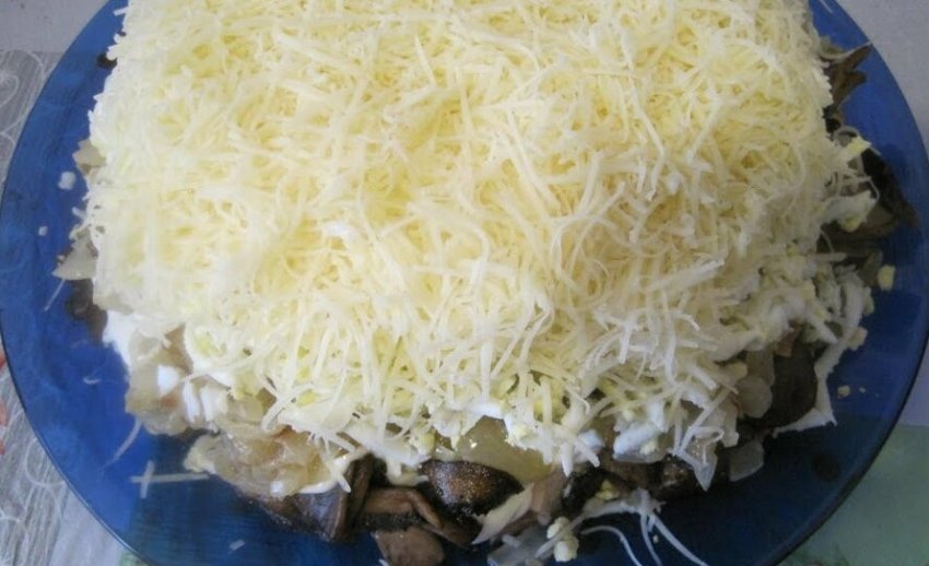 - Наступним шаром укласти посмажені печериці, трохи присолити і поперчити. Промазати майонезом.