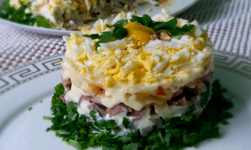 - Відварений язик порубати кубиками або соломкою. Викласти в підготовлену страву першим шаром і промазати його майонезом.
