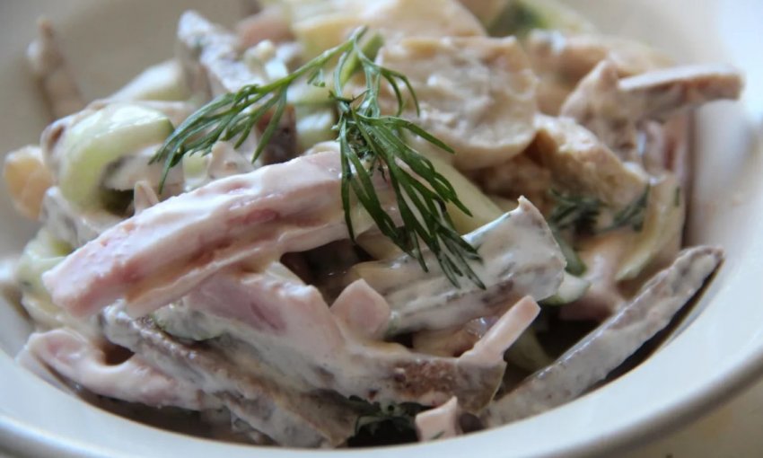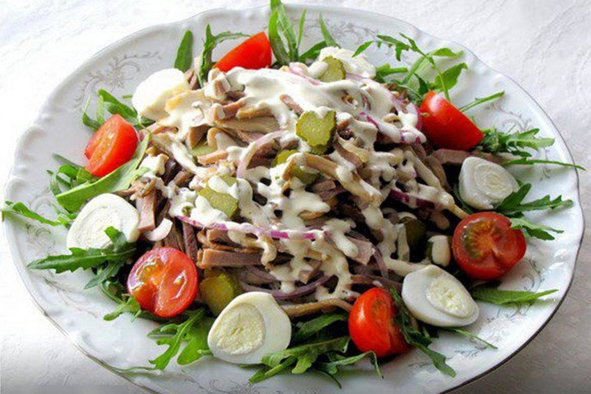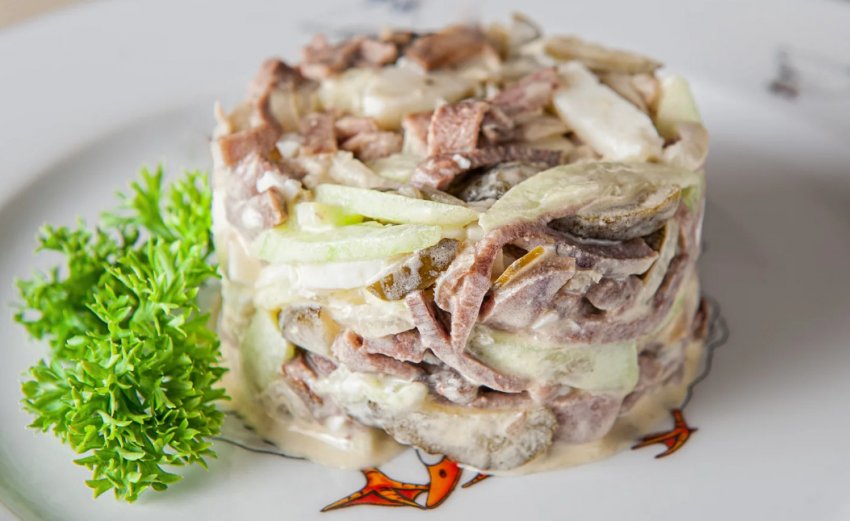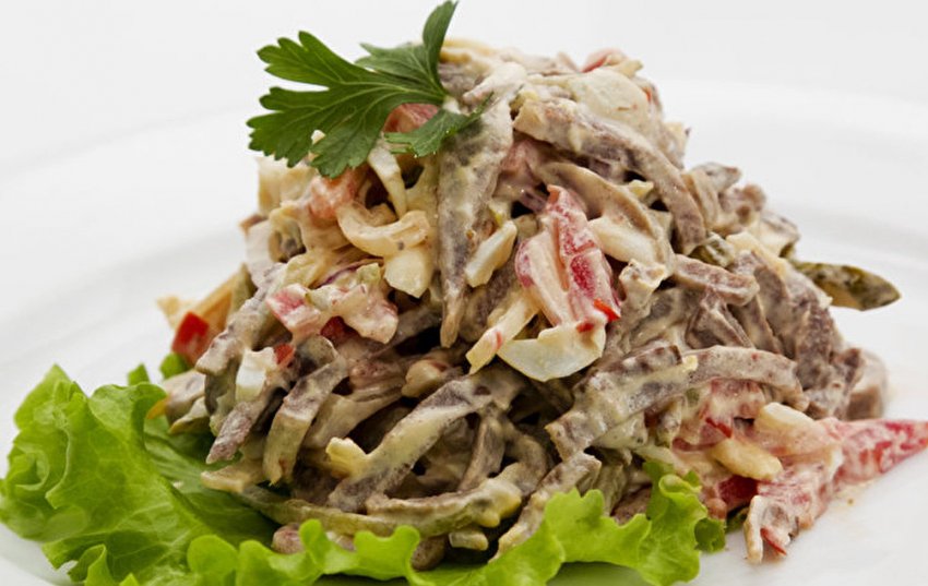 Салат із яловичого язика завжди виходить вишуканим і досить поживним. Цей субпродукт не має волокон і після відварювання завжди виходить ніжний на смак. Існує безліч варіантів закусок із ним. Особливо добре цей продукт смакує в салатах із печерицями.
