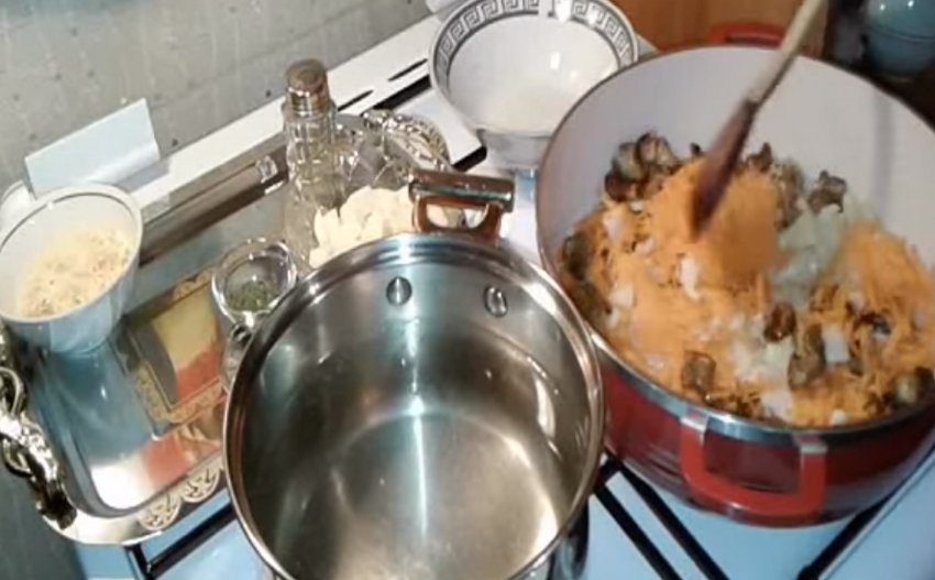 подрібнити на тертці з великими отворами. Помістити цибулю і моркву до грибів.![]()