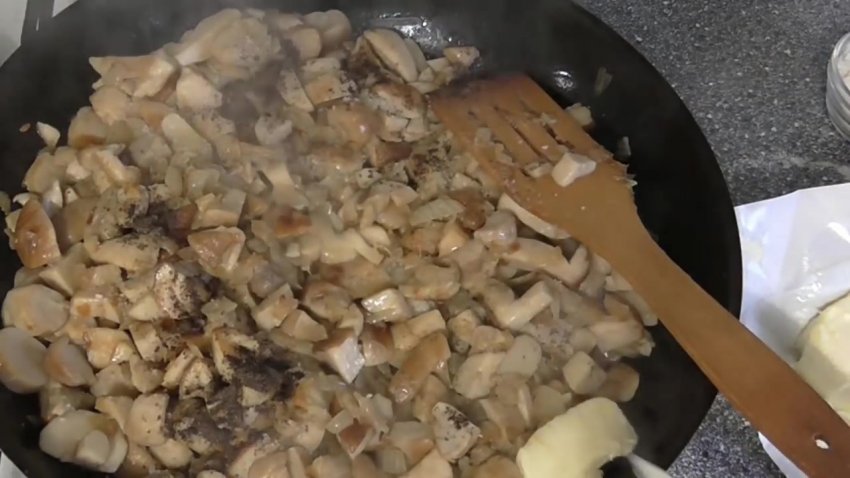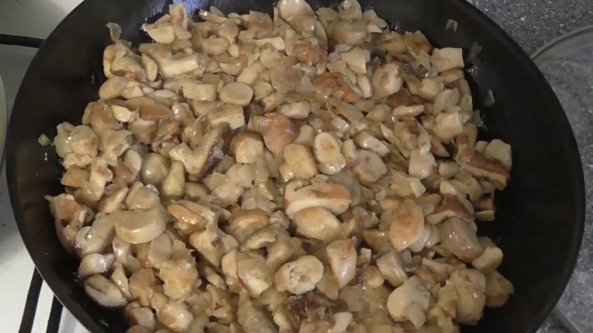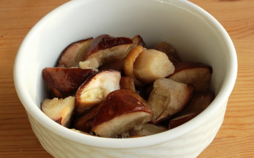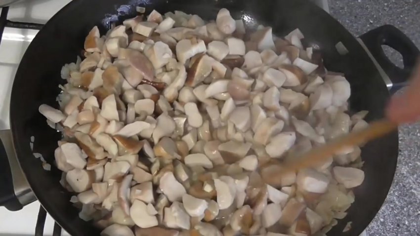 - Поріжте білі гриби скибочками. Смажте їх 15 хвилин (волога, що виділяється плодовими тілами, має випаруватися).