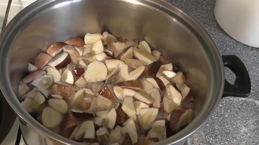 - Підготовлені гриби подрібніть великими скибочками, залийте водою і відваріть протягом 20 хвилин.