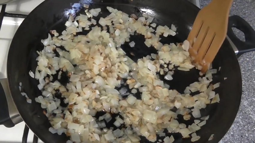 - На розігріту в сковорідці олію викладіть цибулю й обсмажте до прозорого відтінку.