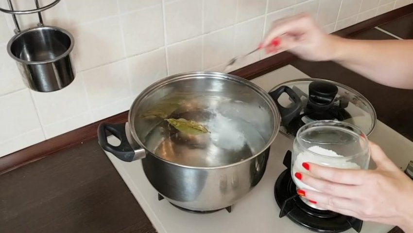каструлю киньте 2 лаврові листки, гриби та 3 ст. л. солі.![]()