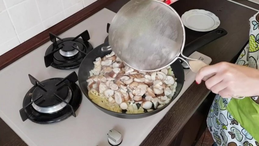 - Перемішайте гриби з цибулею. Тушкуйте протягом 10 хвилин.