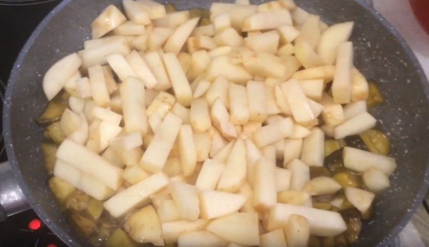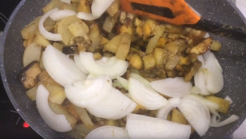 картопля набуде прозорого відтінку, додайте цибулю, яку заздалегідь наріжте півкільцями.![]()