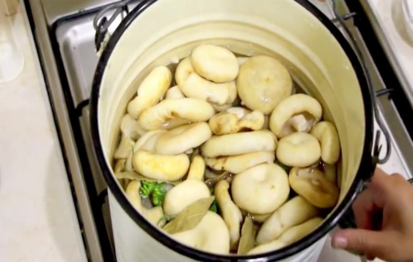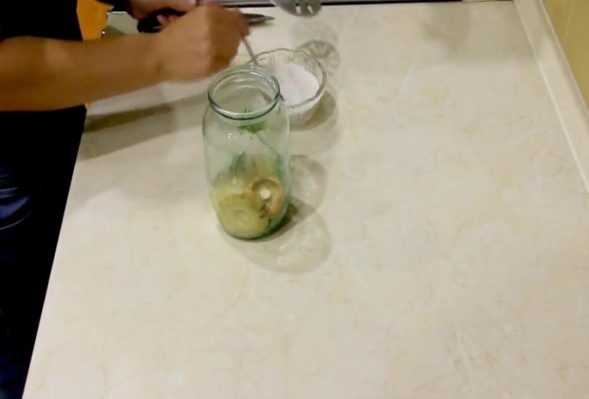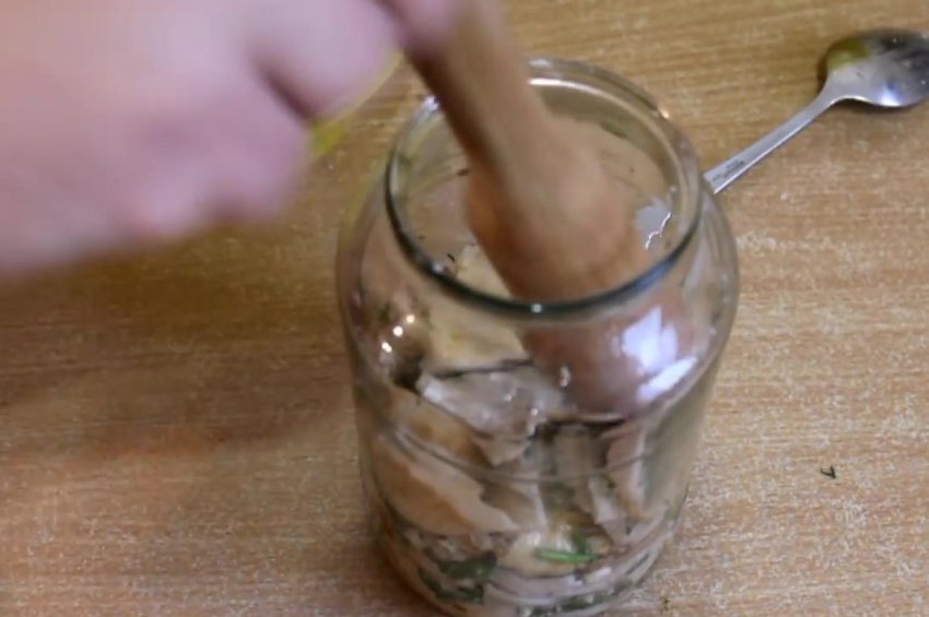 - У банку кладуть нарізаний часник, якщо є, можна додати листя чорної смородини. Потім із каструлі за допомогою шумівки або спеціальної ложки дістають усі гриби і перекладають у банку. Якщо їх багато, вміст банки можна трохи ущільнити, після чого залити маринадом до горлечка і закрутити прокип'яченими металевими кришками.