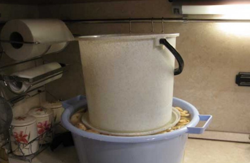 - Вміст бочки накрити зеленню, а потім круглою дошкою з вантажем.