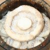 - У грибів зрізати ніжки, приблизно на 1/2 см нижче капелюшка. Обрізані капелюшки укласти в каструлю таким чином, щоб залишок ніжки був спрямований вгору. Гриби мають розташовуватися досить щільно, товщина одного шару - 7-9 см, після чого засипати сіль і спеції.