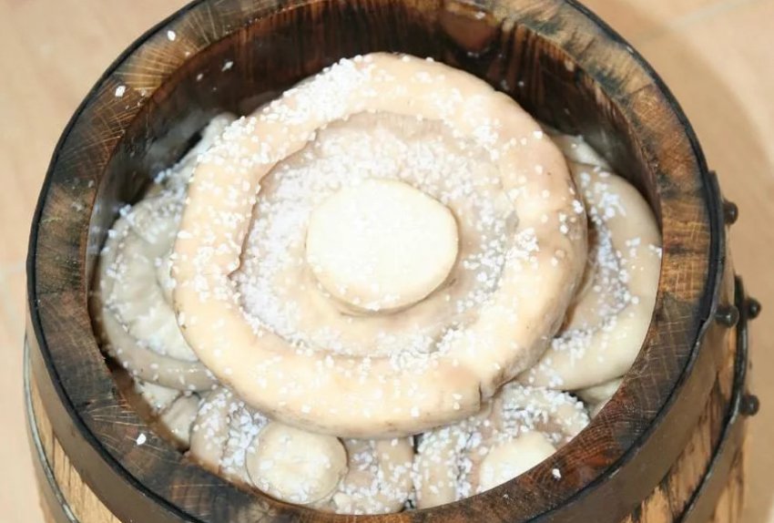 - Через кілька діб грузді пустять сік, а дерев'яне коло потихеньку осідатиме, придавлюючи їх. Коли почнеться цей процес, у бочку можна додавати гриби, пересипані сіллю, доти, доки ємність не буде заповнена.