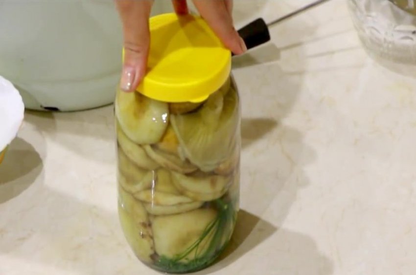 Закрити ємності з грибами пластиковими або металевими кришками під різьбу. Після того як банки охолонуть, поставити їх на холод. Через 4-5 тижнів можна порадувати друзів смачною закускою.![]()