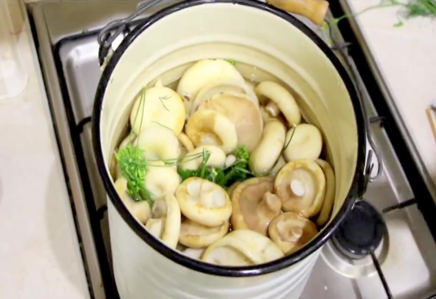 - Промиті гриби знову поміщають у каструлю, яку заповнюють літром води, солять і варять, після того як вміст закипить, 1/3 години.