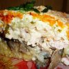 - Останнім шаром викласти курку, нарізану тонкими брусочками.