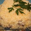 - Зняти форму. Прикрасити салат тертим сиром і червоною ікрою.