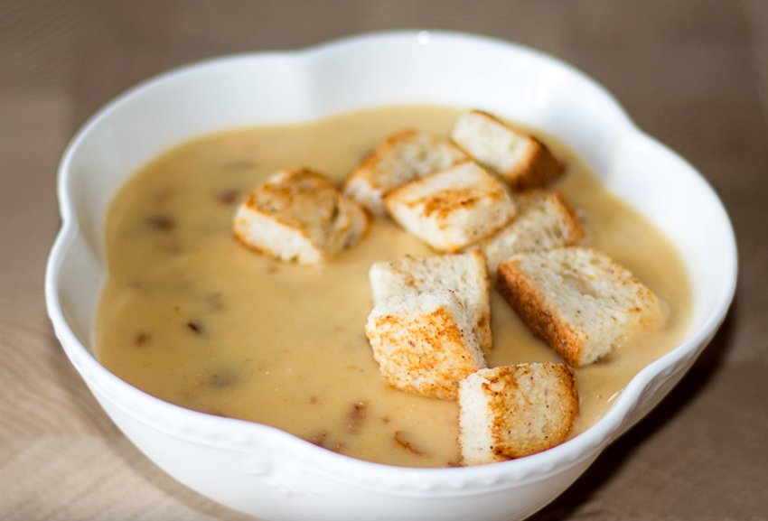 - Щойно рідина загусне, додайте в ємність вершки та закип'ятіть суміш протягом 5-10 хвилин. Розлийте суп по глибоких тарілках, прикрасьте його сухариками.