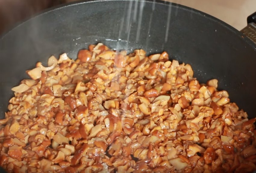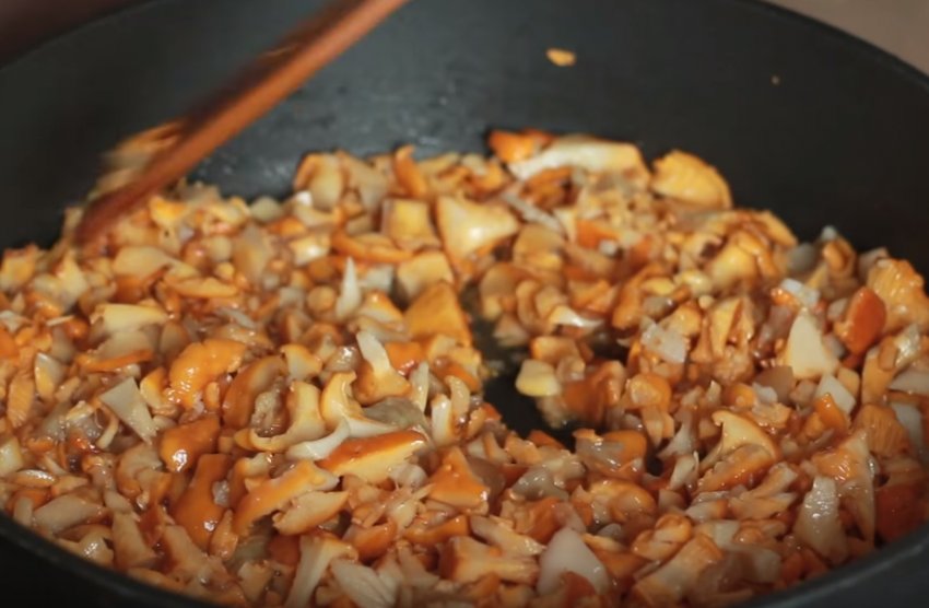 - Підсмажте на сковорідці суміш із лисичок, цибулі та моркви.