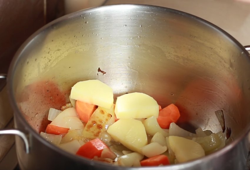 Додайте в каструлю цибулю, моркву і картоплю, після чого обсмажте овочі на середньому вогні до золотистої скоринки.![]()