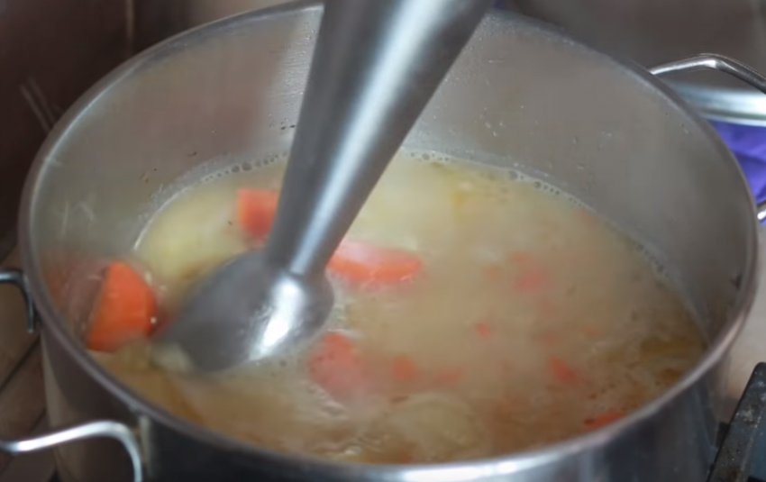 - Дістаньте із супу лавровий лист, а потім кожен інгредієнт перетріть блендером до однорідної маси.