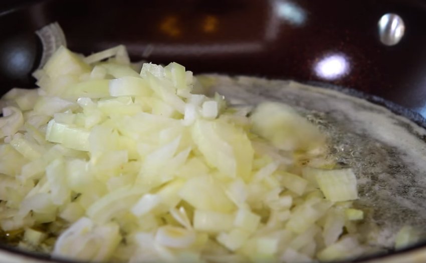- Цибулю подрібніть кубиками. Приступіть до смаження, попередньо наливши в пательню 5 ст. л. рослинної олії.