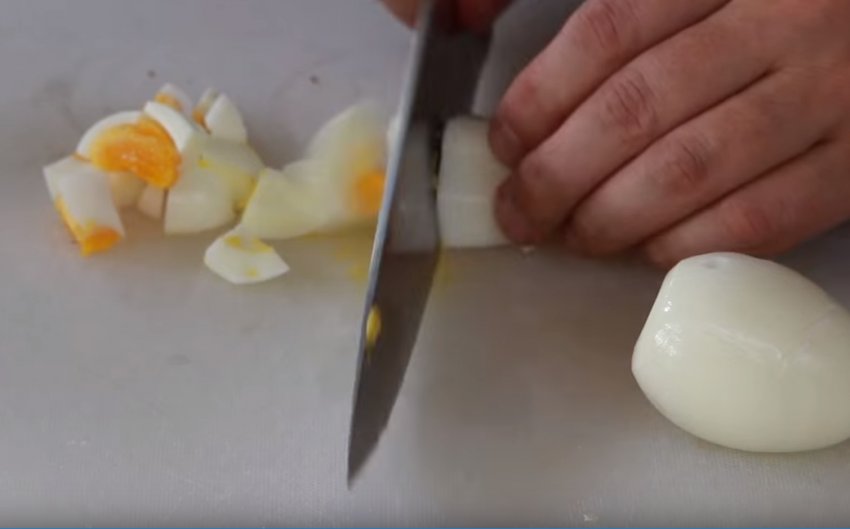 Відварити 2 яйця, очистити їх і нарізати великими шматками.![]()