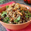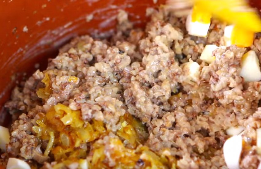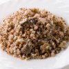 - Коли каша приготується, всипте її на сковорідку, де вже перебувають гриби та цибуля.