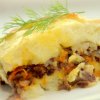 - У форму для духовки помістити половину пюре з картоплі, добре вирівнюючи поверхню. Зверху розкласти грибну масу. Третім шаром викласти решту пюре.