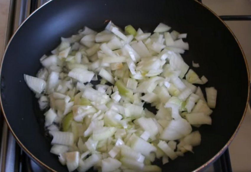 - Очищену цибулю нарубати півкільцями і покласти на гарячу сковороду з соняшниковою олією. Просмажити до отримання золотистого кольору.