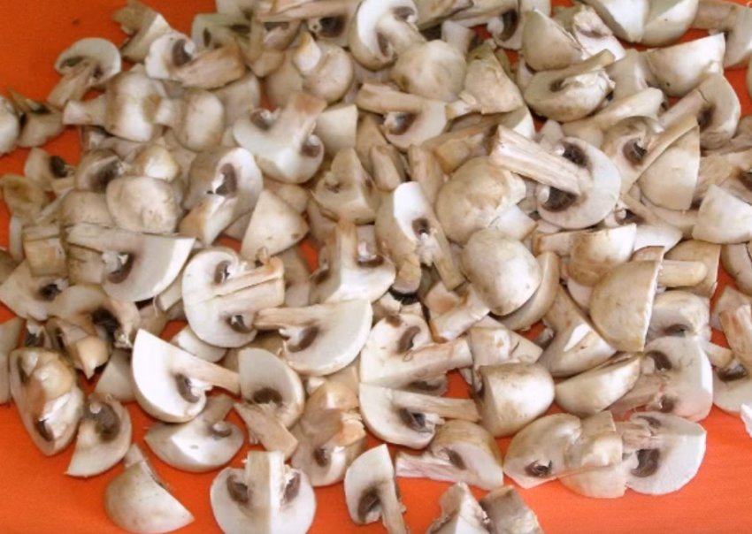 - Печериці відварити в злегка підсоленій воді, а потім нарізати пластинками.
