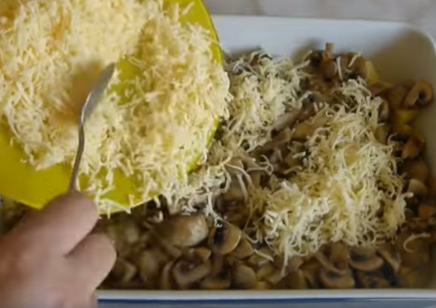 - За 10 хвилин до готовності вийняти запіканку і посипати тертим сиром. Помістити страву заново в духовку і тримати ще 10 хвилин.
