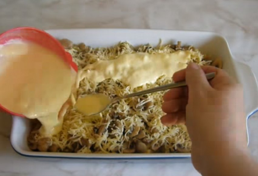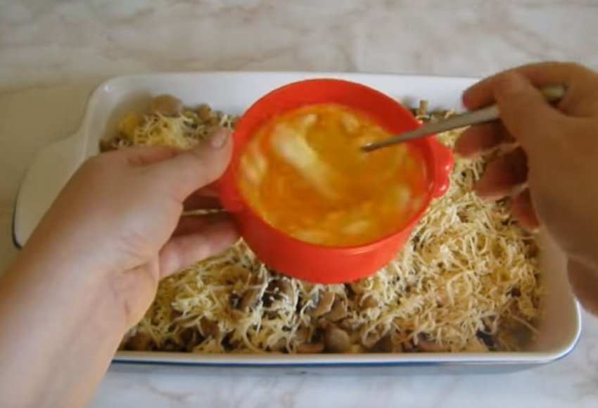 - На дно покласти шар печериць. Зверху нього розподілити картоплю. Потім на інгредієнти рівномірно налити суміш із яєць і вершків.