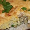 - Форму для духовки намазати соняшниковою олією. У ній нижнім шаром розмістити м'ясо курки, приправивши спеціями за смаком. Потім зверху розподілити 1/2 об'єму картопляної маси. Приправити мускатним горіхом. Наступним шаром розкласти грибну масу, потім цибулю і пюре, що залишилося.