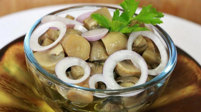- Очищену цибулю наріжте тонким пером, з'єднайте з грибами і маринадом, перемішайте і поставте в холодне місце.