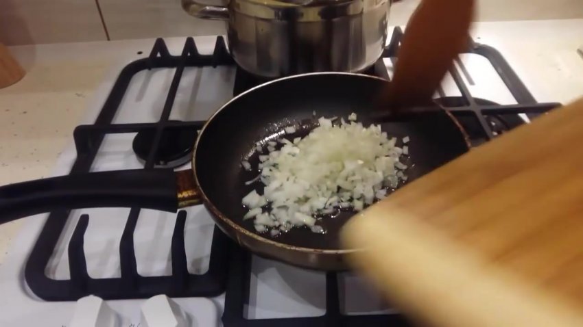 - Налити на сковорідку олію, смажити цибулю протягом 7 хвилин.