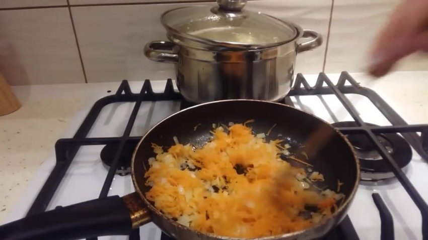- Нагріти сковорідку з олією. Обсмажити цибулю і моркву до напівпрозорості.