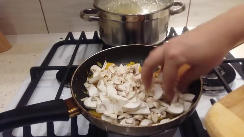 - Коли крупа буде готова, взяти іншу каструлю і помістити туди гриби.