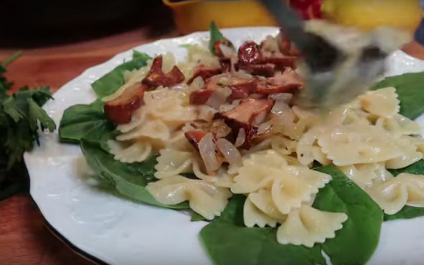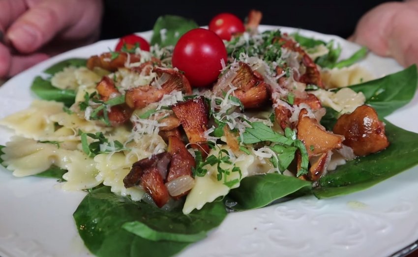 Сформувати красиво салат для подачі: перший шар - листя шпинату, потім - паста, після - лисички. Подрібнити петрушку з листям смородини, посипати зверху. Натерти трохи сиру і присипати чорним перцем.![]()