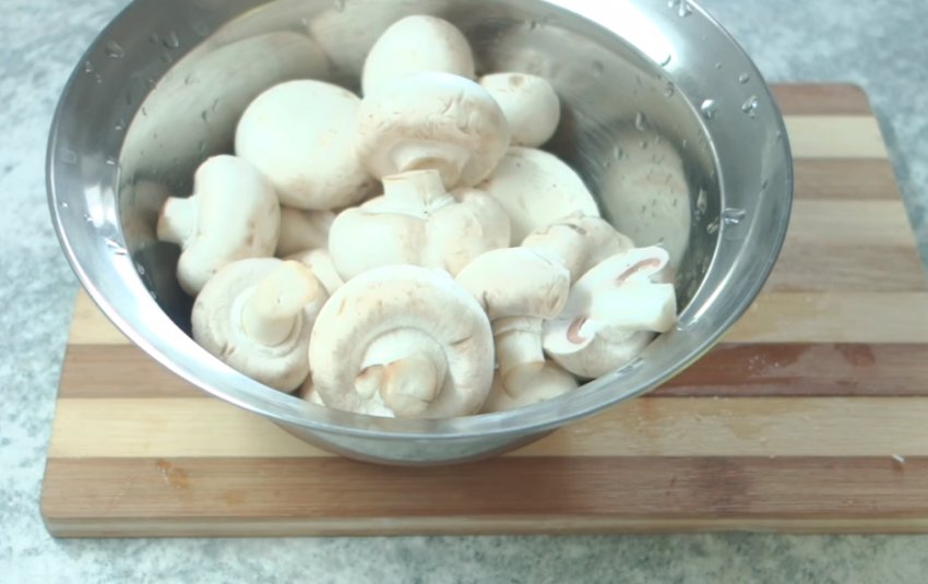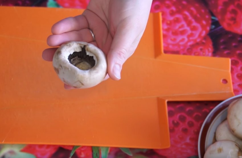 Промийте печериці, просушіть, відокремте та приберіть ніжки. Для приготування знадобляться тільки їхні капелюшки.![]()