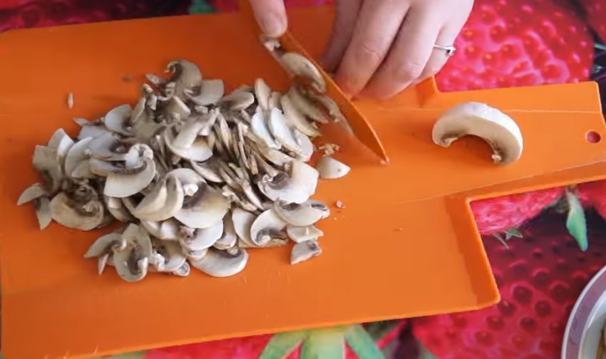 Гострим ножем наріжте тонкими скибочками капелюшки, складіть їх окремо.![]()